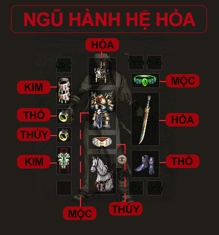 - Một số thuộc tính cần có trong các món đồ hệ Hỏa như: nón hỏa (thời gian làm chậm, phòng thủ vật lý), vũ khí hỏa (hỏa sát nội công), áo mộc (tgph 40, kháng lôi), dây chuyền mộc (kháng tất cả + kháng lôi), giày thổ (kháng băng, thời gian trúng độc, tốc độ di chuyển > 19 %), nhẫn thổ (kháng băng), bao tay/ngọc bội kim (kháng độc), nhẫn thủy (kháng hỏa).